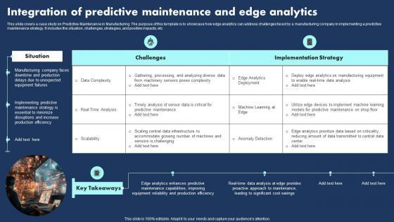 This slide covers a case study on Predictive Maintenance in Manufacturing. The purpose of this template is to showcase how edge analytics can address challenges faced by a manufacturing company in implementing a predictive maintenance strategy. It includes the situation, challenges, strategies, and positive impacts, etc.Showcasing this set of slides titled Integration Of Predictive Maintenance And Edge Analytics Formats Pdf The topics addressed in these templates are Predictive Maintenance, Gathering Processing, Machine Learning All the content presented in this PPT design is completely editable. Download it and make adjustments in color, background, font etc. as per your unique business setting. This slide covers a case study on Predictive Maintenance in Manufacturing. The purpose of this template is to showcase how edge analytics can address challenges faced by a manufacturing company in implementing a predictive maintenance strategy. It includes the situation, challenges, strategies, and positive impacts, etc.