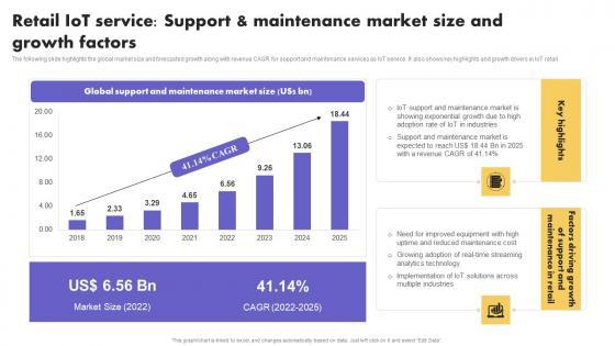 The following slide highlights the global market size and forecasted growth along with revenue CAGR for support and maintenance services as IoT service. It also shows key highlights and growth drivers in IoT retail This Retail IoT Service Support And Maintenance Guide For Retail IoT Solutions Analysis Mockup Pdf is perfect for any presentation, be it in front of clients or colleagues. It is a versatile and stylish solution for organizing your meetings. The Retail IoT Service Support And Maintenance Guide For Retail IoT Solutions Analysis Mockup Pdf features a modern design for your presentation meetings. The adjustable and customizable slides provide unlimited possibilities for acing up your presentation. Slidegeeks has done all the homework before launching the product for you. So, do not wait, grab the presentation templates today The following slide highlights the global market size and forecasted growth along with revenue CAGR for support and maintenance services as IoT service. It also shows key highlights and growth drivers in IoT retail