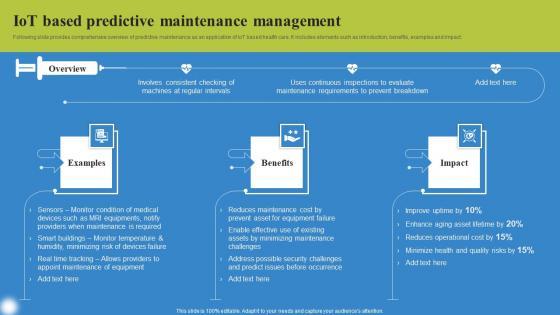 Following slide provides comprehensive overview of predictive maintenance as an application of IoT based health care. It includes elements such as introduction, benefits, examples and impact. Want to ace your presentation in front of a live audience Our IoT Based Predictive Maintenance Deploying IoT Solutions For Enhanced Healthcare Microsoft Pdf can help you do that by engaging all the users towards you. Slidegeeks experts have put their efforts and expertise into creating these impeccable powerpoint presentations so that you can communicate your ideas clearly. Moreover, all the templates are customizable, and easy to edit and downloadable. Use these for both personal and commercial use. Following slide provides comprehensive overview of predictive maintenance as an application of IoT based health care. It includes elements such as introduction, benefits, examples and impact.