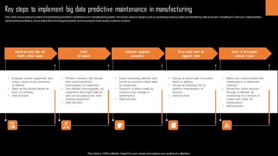 This slide showcases procedure of establishing predictive maintenance in manufacturing plants. It includes various stages such as assessing previous data and identifying critical assets, installing IoT sensors, implementing equipment parameters, set up action items for triggered alerts and ensuring to have proper systems in place.Pitch your topic with ease and precision using this Key Steps To Implement Big Data Predictive Maintenance In Manufacturing Diagrams Pdf This layout presents information on Implement Equipment Parameters, Ensure Proper, Systems Place It is also available for immediate download and adjustment. So, changes can be made in the color, design, graphics or any other component to create a unique layout. This slide showcases procedure of establishing predictive maintenance in manufacturing plants. It includes various stages such as assessing previous data and identifying critical assets, installing IoT sensors, implementing equipment parameters, set up action items for triggered alerts and ensuring to have proper systems in place.