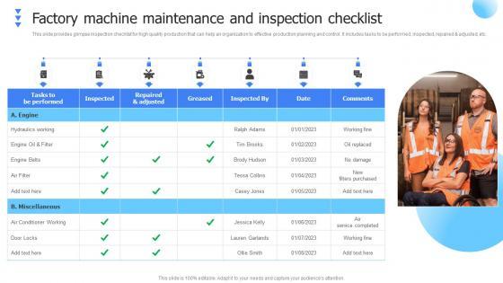 This slide provides glimpse inspection checklist for high quality production that can help an organization to effective production planning and control. It includes tasks to be performed, inspected, repaired and adjusted, etc.From laying roadmaps to briefing everything in detail, our templates are perfect for you. You can set the stage with your presentation slides. All you have to do is download these easy-to-edit and customizable templates. Factory Machine Maintenance And Inspection Production Quality Administration Brochure Pdf will help you deliver an outstanding performance that everyone would remember and praise you for. Do download this presentation today. This slide provides glimpse inspection checklist for high quality production that can help an organization to effective production planning and control. It includes tasks to be performed, inspected, repaired and adjusted, etc.