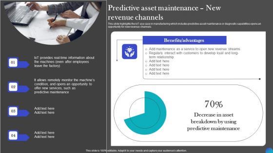This slide highlights the IoT use case in manufacturing which includes predictive asset maintenance or diagnostic capabilities opens an opportunity for new revenue channels. This Predictive Asset Maintenance New Revenue IOT Adoption Manufacturing Themes PDF from Slidegeeks makes it easy to present information on your topic with precision. It provides customization options, so you can make changes to the colors, design, graphics, or any other component to create a unique layout. It is also available for immediate download, so you can begin using it right away. Slidegeeks has done good research to ensure that you have everything you need to make your presentation stand out. Make a name out there for a brilliant performance. This slide highlights the IoT use case in manufacturing which includes predictive asset maintenance or diagnostic capabilities opens an opportunity for new revenue channels.
