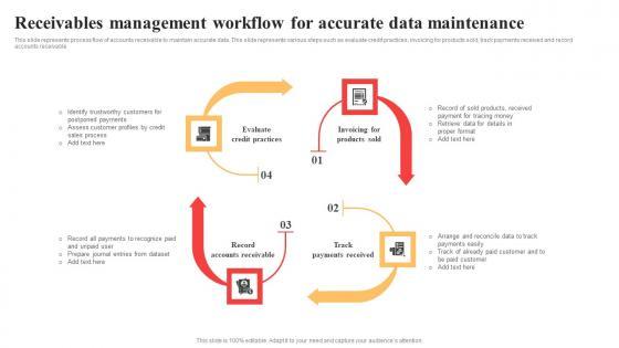 This slide represents process flow of accounts receivable to maintain accurate data. This slide represents various steps such as evaluate credit practices, invoicing for products sold, track payments received and record accounts receivable Showcasing this set of slides titled Receivables Management Workflow For Accurate Data Maintenance Topics Pdf. The topics addressed in these templates are Evaluate Credit Practices, Invoicing For Products Sold, Track Payments Received. All the content presented in this PPT design is completely editable. Download it and make adjustments in color, background, font etc. as per your unique business setting. This slide represents process flow of accounts receivable to maintain accurate data. This slide represents various steps such as evaluate credit practices, invoicing for products sold, track payments received and record accounts receivable