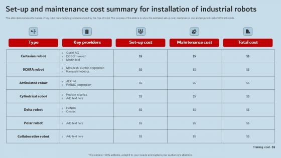 This slide demonstrates the names of key robot manufacturing companies listed by the type of robot. The purpose of this slide is to show the estimated set-up cost, maintenance cost and projected cost of different robots. Do you have an important presentation coming up Are you looking for something that will make your presentation stand out from the rest Look no further than Set Up And Maintenance Cost Summary For Installation Industrial Robots Guidelines Pdf With our professional designs, you can trust that your presentation will pop and make delivering it a smooth process. And with Slidegeeks, you can trust that your presentation will be unique and memorable. So why wait Grab Set Up And Maintenance Cost Summary For Installation Industrial Robots Guidelines Pdf today and make your presentation stand out from the rest. This slide demonstrates the names of key robot manufacturing companies listed by the type of robot. The purpose of this slide is to show the estimated set-up cost, maintenance cost and projected cost of different robots.