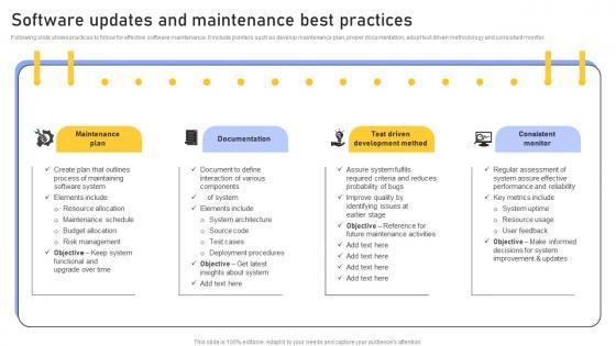 Following slide shows practices to follow for effective software maintenance. It include pointers such as develop maintenance plan, proper documentation, adopt test driven methodology and consistent monitor. Presenting this PowerPoint presentation, titled Software Updates Maintenance Building Utility Billing And Invoicing Management System Microsoft Pdf, with topics curated by our researchers after extensive research. This editable presentation is available for immediate download and provides attractive features when used. Download now and captivate your audience. Presenting this Software Updates Maintenance Building Utility Billing And Invoicing Management System Microsoft Pdf. Our researchers have carefully researched and created these slides with all aspects taken into consideration. This is a completely customizable Software Updates Maintenance Building Utility Billing And Invoicing Management System Microsoft Pdf that is available for immediate downloading. Download now and make an impact on your audience. Highlight the attractive features available with our PPTs. Following slide shows practices to follow for effective software maintenance. It include pointers such as develop maintenance plan, proper documentation, adopt test driven methodology and consistent monitor.