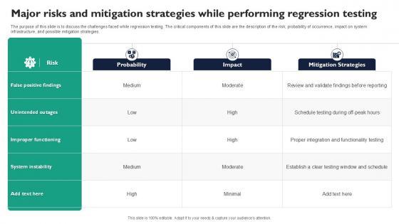 The purpose of this slide is to discuss the challenges faced while regression testing. The critical components of this slide are the description of the risk, probability of occurrence, impact on system infrastructure, and possible mitigation strategies. Do you have an important presentation coming up Are you looking for something that will make your presentation stand out from the rest Look no further than Major Risks And Mitigation Strategies Partial Regression Testing For A Best PPT Template With our professional designs, you can trust that your presentation will pop and make delivering it a smooth process. And with Slidegeeks, you can trust that your presentation will be unique and memorable. So why wait Grab Major Risks And Mitigation Strategies Partial Regression Testing For A Best PPT Template today and make your presentation stand out from the rest The purpose of this slide is to discuss the challenges faced while regression testing. The critical components of this slide are the description of the risk, probability of occurrence, impact on system infrastructure, and possible mitigation strategies.