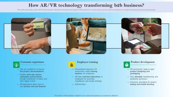 This slide represents use for AR VR technology for development and transformation of b2b business. It covers areas such as customer experience, employee training and product development. Slidegeeks is here to make your presentations a breeze with How AR VR Technology Transforming B2B Business B2B Digital Commerce Rules Pdf With our easy-to-use and customizable templates, you can focus on delivering your ideas rather than worrying about formatting. With a variety of designs to choose from, you are sure to find one that suits your needs. And with animations and unique photos, illustrations, and fonts, you can make your presentation pop. So whether you are giving a sales pitch or presenting to the board, make sure to check out Slidegeeks first. This slide represents use for AR VR technology for development and transformation of b2b business. It covers areas such as customer experience, employee training and product development.