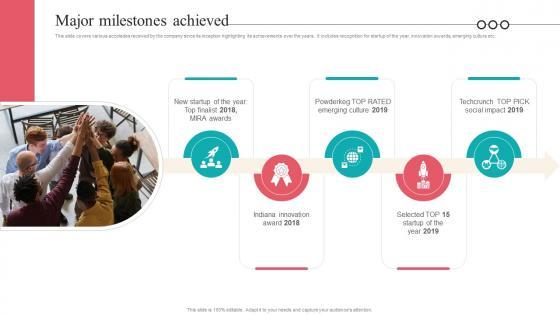This slide shows information regarding the key achievements of the organizations which offers AI powered software solutions to automate customer experiences and improve customer retention. If your project calls for a presentation, then Slidegeeks is your go-to partner because we have professionally designed, easy-to-edit templates that are perfect for any presentation. After downloading, you can easily edit Major Milestones Achieved Customer Experience Management Company Investor Funding Elevator Pitch Deck and make the changes accordingly. You can rearrange slides or fill them with different images. Check out all the handy templates This slide shows information regarding the key achievements of the organizations which offers AI powered software solutions to automate customer experiences and improve customer retention.