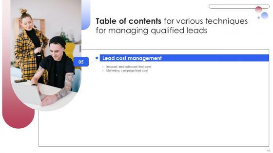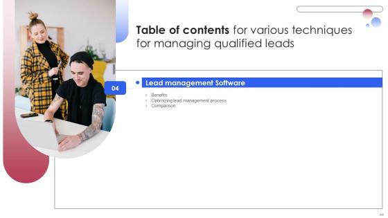 This Various Techniques For Managing Qualified Leads Table Of Contents Template PDF is perfect for any presentation, be it in front of clients or colleagues. It is a versatile and stylish solution for organizing your meetings. The Various Techniques For Managing Qualified Leads Table Of Contents Template PDF features a modern design for your presentation meetings. The adjustable and customizable slides provide unlimited possibilities for acing up your presentation. Slidegeeks has done all the homework before launching the product for you. So, do not wait, grab the presentation templates today Our Various Techniques For Managing Qualified Leads Table Of Contents Template PDF are topically designed to provide an attractive backdrop to any subject. Use them to look like a presentation pro.