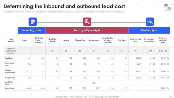 This slide covers cost analysis for inbound and outbound leads. It includes details such as various lead sources, incoming data, lead quality analysis, and cost analysis. If you are looking for a format to display your unique thoughts, then the professionally designed Effective Strategy For Qualified Leads Generation Various Techniques For Managing Mockup PDF is the one for you. You can use it as a Google Slides template or a PowerPoint template. Incorporate impressive visuals, symbols, images, and other charts. Modify or reorganize the text boxes as you desire. Experiment with shade schemes and font pairings. Alter, share or cooperate with other people on your work. Download Effective Strategy For Qualified Leads Generation Various Techniques For Managing Mockup PDF and find out how to give a successful presentation. Present a perfect display to your team and make your presentation unforgettable. This slide covers cost analysis for inbound and outbound leads. It includes details such as various lead sources, incoming data, lead quality analysis, and cost analysis.