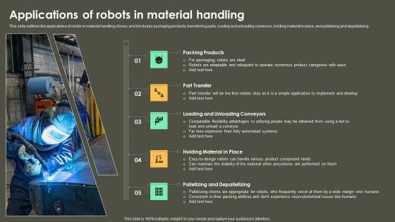 This slide outlines the applications of robots in material handling chores, and it includes packaging products, transferring parts, loading and unloading conveyors, holding material in place, and palletizing and depalletizing. Slidegeeks is one of the best resources for PowerPoint templates. You can download easily and regulate Intelligent Manufacturing Applications Of Robots In Material Handling Introduction PDF for your personal presentations from our wonderful collection. A few clicks is all it takes to discover and get the most relevant and appropriate templates. Use our Templates to add a unique zing and appeal to your presentation and meetings. All the slides are easy to edit and you can use them even for advertisement purposes.