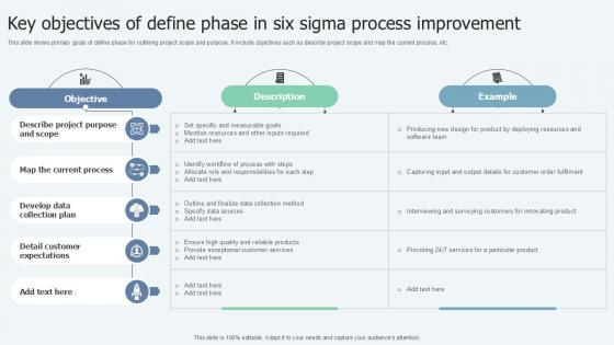 This slide shows primary goals of define phase for outlining project scope and purpose. It include objectives such as describe project scope and map the current process, etc. Crafting an eye-catching presentation has never been more straightforward. Let your presentation shine with this tasteful yet straightforward Key Objectives Of Define Phase In Lean Six Sigma In Manufacturing Ppt Example template. It offers a minimalistic and classy look that is great for making a statement. The colors have been employed intelligently to add a bit of playfulness while still remaining professional. Construct the ideal Key Objectives Of Define Phase In Lean Six Sigma In Manufacturing Ppt Example that effortlessly grabs the attention of your audience Begin now and be certain to wow your customers This slide shows primary goals of define phase for outlining project scope and purpose. It include objectives such as describe project scope and map the current process, etc.