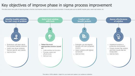 This slide shows main goals of improving phase to find the most feasible solution for the root cause of problem. It include goals such as identify feasible goals, select best solution, etc. Make sure to capture your audiences attention in your business displays with our gratis customizable Key Objectives Of Improve Phase In Lean Six Sigma In Manufacturing Ppt Slide. These are great for business strategies, office conferences, capital raising or task suggestions. If you desire to acquire more customers for your tech business and ensure they stay satisfied, create your own sales presentation with these plain slides. This slide shows main goals of improving phase to find the most feasible solution for the root cause of problem. It include goals such as identify feasible goals, select best solution, etc.
