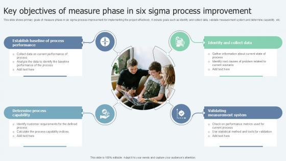 This slide shows primary goals of measure phase in six sigma process improvement for implementing the project effectively. It include goals such as identify and collect data, validate measurement system and determine capability, etc. Formulating a presentation can take up a lot of effort and time, so the content and message should always be the primary focus. The visuals of the PowerPoint can enhance the presenters message, so our Key Objectives Of Measure Phase Lean Six Sigma In Manufacturing Ppt Sample was created to help save time. Instead of worrying about the design, the presenter can concentrate on the message while our designers work on creating the ideal templates for whatever situation is needed. Slidegeeks has experts for everything from amazing designs to valuable content, we have put everything into Key Objectives Of Measure Phase Lean Six Sigma In Manufacturing Ppt Sample This slide shows primary goals of measure phase in six sigma process improvement for implementing the project effectively. It include goals such as identify and collect data, validate measurement system and determine capability, etc.