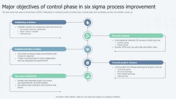 This slide shows main goals of control phase in DMAIC methodology for closing the project on positive basis. It include goals such as validating success, imp mentation of plan, etc. Welcome to our selection of the Major Objectives Of Control Phase Lean Six Sigma In Manufacturing Ppt Powerpoint. These are designed to help you showcase your creativity and bring your sphere to life. Planning and Innovation are essential for any business that is just starting out. This collection contains the designs that you need for your everyday presentations. All of our PowerPoints are 100Percent editable, so you can customize them to suit your needs. This multi-purpose template can be used in various situations. Grab these presentation templates today. This slide shows main goals of control phase in DMAIC methodology for closing the project on positive basis. It include goals such as validating success, imp mentation of plan, etc.