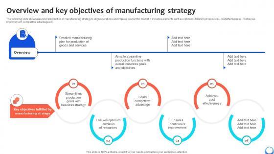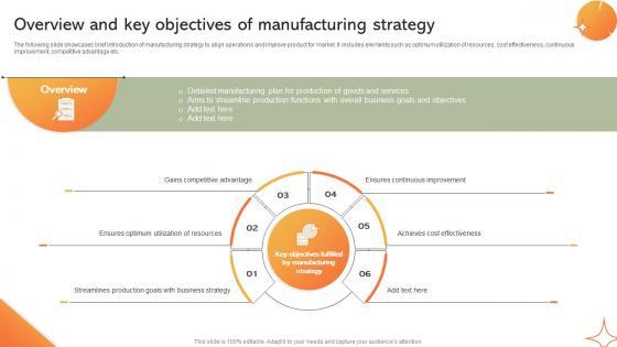 The following slide showcases brief introduction of manufacturing strategy to align operations and improve product for market. It includes elements such as optimum utilization of resources, cost effectiveness, continuous improvement, competitive advantage etc. Retrieve professionally designed Overview And Key Objectives Of Manufacturing Implementing Manufacturing Strategy SS V to effectively convey your message and captivate your listeners. Save time by selecting pre-made slideshows that are appropriate for various topics, from business to educational purposes. These themes come in many different styles, from creative to corporate, and all of them are easily adjustable and can be edited quickly. Access them as PowerPoint templates or as Google Slides themes. You do not have to go on a hunt for the perfect presentation because Slidegeeks got you covered from everywhere. The following slide showcases brief introduction of manufacturing strategy to align operations and improve product for market. It includes elements such as optimum utilization of resources, cost effectiveness, continuous improvement, competitive advantage etc.