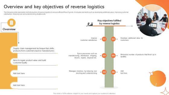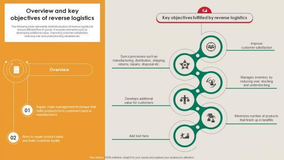 The following slide represents brief introduction of reverse logistics to ensure efficient flow of goods .It includes elements such as developing additional value, improving customer satisfaction, reducing over and understocking situations etc. Do you have an important presentation coming up Are you looking for something that will make your presentation stand out from the rest Look no further than Overview And Key Objectives Of Reverse Logistics Manufacturing Strategy Driving Industry 4 0. With our professional designs, you can trust that your presentation will pop and make delivering it a smooth process. And with Slidegeeks, you can trust that your presentation will be unique and memorable. So why wait Grab Overview And Key Objectives Of Reverse Logistics Manufacturing Strategy Driving Industry 4 0 today and make your presentation stand out from the rest The following slide represents brief introduction of reverse logistics to ensure efficient flow of goods .It includes elements such as developing additional value, improving customer satisfaction, reducing over and understocking situations etc.