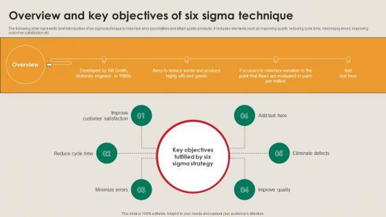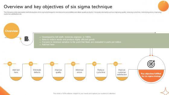The following slide represents brief introduction of six sigma technique to minimize error possibilities and attain quality products. It includes elements such as improving quality, reducing cycle time, minimizing errors, improving customer satisfaction etc. Presenting this PowerPoint presentation, titled Overview And Key Objectives Of Six Sigma Technique Implementing Manufacturing Strategy SS V, with topics curated by our researchers after extensive research. This editable presentation is available for immediate download and provides attractive features when used. Download now and captivate your audience. Presenting this Overview And Key Objectives Of Six Sigma Technique Implementing Manufacturing Strategy SS V. Our researchers have carefully researched and created these slides with all aspects taken into consideration. This is a completely customizable Overview And Key Objectives Of Six Sigma Technique Implementing Manufacturing Strategy SS V that is available for immediate downloading. Download now and make an impact on your audience. Highlight the attractive features available with our PPTs. The following slide represents brief introduction of six sigma technique to minimize error possibilities and attain quality products. It includes elements such as improving quality, reducing cycle time, minimizing errors, improving customer satisfaction etc.
