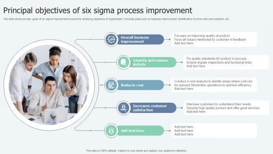 This slide shows primary goals of six sigma improvement process for achieving objectives of organization. It include goals such as business improvement, identification of errors and cost reduction, etc. From laying roadmaps to briefing everything in detail, our templates are perfect for you. You can set the stage with your presentation slides. All you have to do is download these easy-to-edit and customizable templates. Principal Objectives Of Lean Six Sigma In Manufacturing Ppt Slide will help you deliver an outstanding performance that everyone would remember and praise you for. Do download this presentation today. This slide shows primary goals of six sigma improvement process for achieving objectives of organization. It include goals such as business improvement, identification of errors and cost reduction, etc.