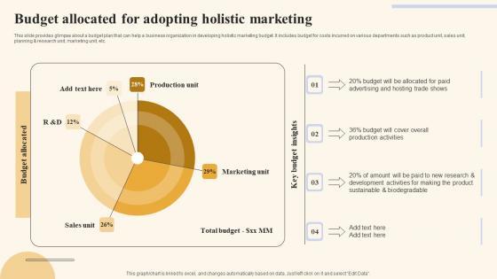 This slide provides glimpse about a budget plan that can help a business organization in developing holistic marketing budget. It includes budget for costs incurred on various departments such as product unit, sales unit, planning and research unit, marketing unit, etc. Are you in need of a template that can accommodate all of your creative concepts This one is crafted professionally and can be altered to fit any style. Use it with Google Slides or PowerPoint. Include striking photographs, symbols, depictions, and other visuals. Fill, move around, or remove text boxes as desired. Test out color palettes and font mixtures. Edit and save your work, or work with colleagues. Download Budget Allocated For Holistic Marketing Strategies To Optimize Sample Pdf and observe how to make your presentation outstanding. Give an impeccable presentation to your group and make your presentation unforgettable. This slide provides glimpse about a budget plan that can help a business organization in developing holistic marketing budget. It includes budget for costs incurred on various departments such as product unit, sales unit, planning and research unit, marketing unit, etc.