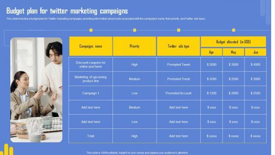 This slide includes a budget plan for Twitter marketing campaigns, providing information about costs associated with the campaigns name, their priority, and Twitter Ads types. Create an editable Optimizing Twitter For Online Budget Plan For Twitter Marketing Campaigns Themes Pdf that communicates your idea and engages your audience. Whether you are presenting a business or an educational presentation, pre-designed presentation templates help save time. Optimizing Twitter For Online Budget Plan For Twitter Marketing Campaigns Themes Pdf is highly customizable and very easy to edit, covering many different styles from creative to business presentations. Slidegeeks has creative team members who have crafted amazing templates. So, go and get them without any delay. This slide includes a budget plan for Twitter marketing campaigns, providing information about costs associated with the campaigns name, their priority, and Twitter Ads types.