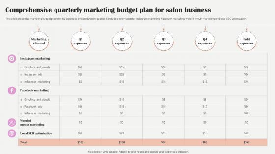 This slide presents a marketing budget plan with the expenses broken down by quarter. It includes information for Instagram marketing, Facebook marketing, word-of-mouth marketing and local SEO optimization. Whether you have daily or monthly meetings, a brilliant presentation is necessary. Salon Marketing Plan To Optimize Comprehensive Quarterly Marketing Budget Plan Strategy SS V can be your best option for delivering a presentation. Represent everything in detail using Salon Marketing Plan To Optimize Comprehensive Quarterly Marketing Budget Plan Strategy SS V and make yourself stand out in meetings. The template is versatile and follows a structure that will cater to your requirements. All the templates prepared by Slidegeeks are easy to download and edit. Our research experts have taken care of the corporate themes as well. So, give it a try and see the results. This slide presents a marketing budget plan with the expenses broken down by quarter. It includes information for Instagram marketing, Facebook marketing, word-of-mouth marketing and local SEO optimization.