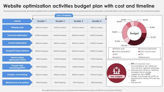 This slide showcases the website optimization budget plan with cost and timeline. It includes activities such as website audit, technical optimization, content optimization, UIUX improvement, SEO, PPC and maintenance and updates. If you are looking for a format to display your unique thoughts, then the professionally designed Website Optimization Activities Budget Plan Accelerating Market Share And Profitability MKT SS V is the one for you. You can use it as a Google Slides template or a PowerPoint template. Incorporate impressive visuals, symbols, images, and other charts. Modify or reorganize the text boxes as you desire. Experiment with shade schemes and font pairings. Alter, share or cooperate with other people on your work. Download Website Optimization Activities Budget Plan Accelerating Market Share And Profitability MKT SS V and find out how to give a successful presentation. Present a perfect display to your team and make your presentation unforgettable. This slide showcases the website optimization budget plan with cost and timeline. It includes activities such as website audit, technical optimization, content optimization, UIUX improvement, SEO, PPC and maintenance and updates.