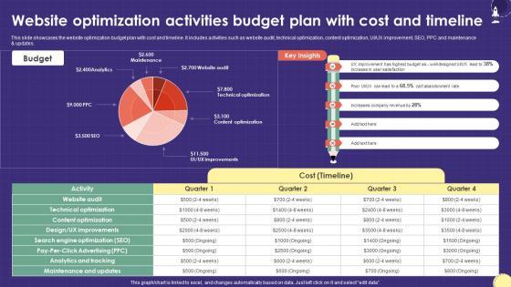 This slide showcases the website optimization budget plan with cost and timeline. It includes activities such as website audit, technical optimization, content optimization, UIUX improvement, SEO, PPC and maintenance and updates. Formulating a presentation can take up a lot of effort and time, so the content and message should always be the primary focus. The visuals of the PowerPoint can enhance the presenters message, so our Website Optimization Activities Budget Plan Marketing Plan For Boosting School Strategy SS V was created to help save time. Instead of worrying about the design, the presenter can concentrate on the message while our designers work on creating the ideal templates for whatever situation is needed. Slidegeeks has experts for everything from amazing designs to valuable content, we have put everything into Website Optimization Activities Budget Plan Marketing Plan For Boosting School Strategy SS V This slide showcases the website optimization budget plan with cost and timeline. It includes activities such as website audit, technical optimization, content optimization, UIUX improvement, SEO, PPC and maintenance and updates.