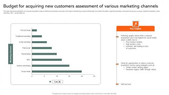 This slide represents estimation of consumer acquisition costs on different social media channels which helps in identifying process inefficiencies. It provides information regarding marketing channels such as pop up shops, traditional marketing, email marketing, SEO, social media etc. Pitch your topic with ease and precision using this Budget For Acquiring New Customers Assessment Of Various Marketing Channels Demonstration Pdf. This layout presents information on Marketing Channels, Budget For Acquiring, Customers Assessment. It is also available for immediate download and adjustment. So, changes can be made in the color, design, graphics or any other component to create a unique layout. This slide represents estimation of consumer acquisition costs on different social media channels which helps in identifying process inefficiencies. It provides information regarding marketing channels such as pop up shops, traditional marketing, email marketing, SEO, social media etc.
