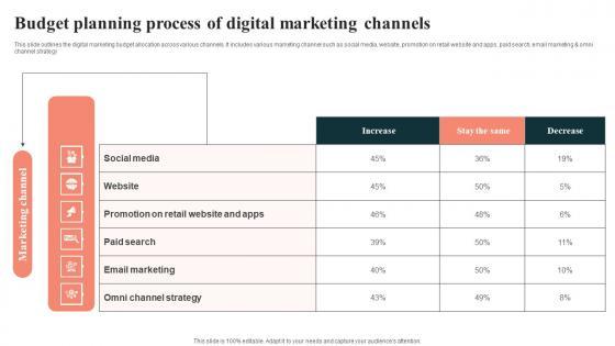 This slide outlines the digital marketing budget allocation across various channels. It includes various marketing channel such as social media, website, promotion on retail website and apps, paid search, email marketing and omni channel strategy. Showcasing this set of slides titled Budget Planning Process Of Digital Marketing Channels Inspiration Pdf. The topics addressed in these templates are Marketing Channel, Budget Planning Process. All the content presented in this PPT design is completely editable. Download it and make adjustments in color, background, font etc. as per your unique business setting. This slide outlines the digital marketing budget allocation across various channels. It includes various marketing channel such as social media, website, promotion on retail website and apps, paid search, email marketing and omni channel strategy.
