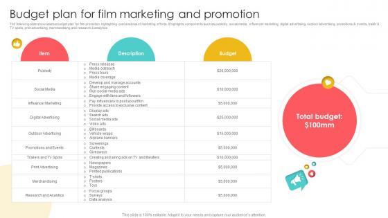 The following slide showcases a budget plan for film promotion highlighting cost analysis of marketing efforts. It highlights components such as publicity, social media, influencer marketing, digital advertising, outdoor advertising, promotions and events, trailer and TV spots, print advertising, merchandising and research and analytics. There are so many reasons you need a Marketing Channels For Movie Budget Plan For Film Marketing And Promotion Strategy SS V. The first reason is you can not spend time making everything from scratch, Thus, Slidegeeks has made presentation templates for you too. You can easily download these templates from our website easily. The following slide showcases a budget plan for film promotion highlighting cost analysis of marketing efforts. It highlights components such as publicity, social media, influencer marketing, digital advertising, outdoor advertising, promotions and events, trailer and TV spots, print advertising, merchandising and research and analytics.