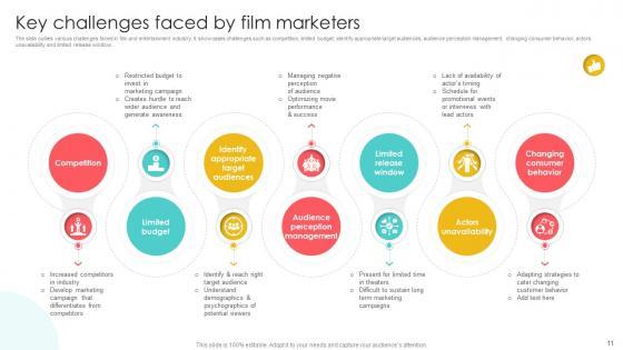 The slide outlies various challenges faced in film and entertainment industry. It showcases challenges such as competition, limited budget, identify appropriate target audiences, audience perception management, changing consumer behavior, actors unavailability and limited release window. The best PPT templates are a great way to save time, energy, and resources. Slidegeeks have 100 percent editable powerpoint slides making them incredibly versatile. With these quality presentation templates, you can create a captivating and memorable presentation by combining visually appealing slides and effectively communicating your message. Download Marketing Channels For Movie Key Challenges Faced By Film Marketers Strategy SS V from Slidegeeks and deliver a wonderful presentation. The slide outlies various challenges faced in film and entertainment industry. It showcases challenges such as competition, limited budget, identify appropriate target audiences, audience perception management, changing consumer behavior, actors unavailability and limited release window.