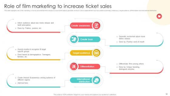 This slide highlights role of film marketing in movie and entertainment industry to drive ticket sales and generate revenue. It showcases element such as create awareness, create buzz, target audience, differentiation and international distribution. Want to ace your presentation in front of a live audience Our Marketing Channels For Movie Role Of Film Marketing To Increase Ticket Sales Strategy SS V can help you do that by engaging all the users towards you. Slidegeeks experts have put their efforts and expertise into creating these impeccable powerpoint presentations so that you can communicate your ideas clearly. Moreover, all the templates are customizable, and easy-to-edit and downloadable. Use these for both personal and commercial use. This slide highlights role of film marketing in movie and entertainment industry to drive ticket sales and generate revenue. It showcases element such as create awareness, create buzz, target audience, differentiation and international distribution.