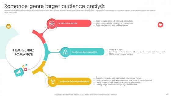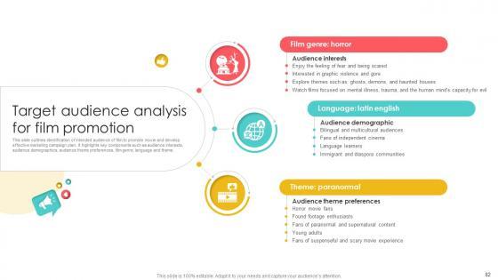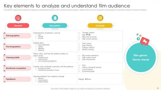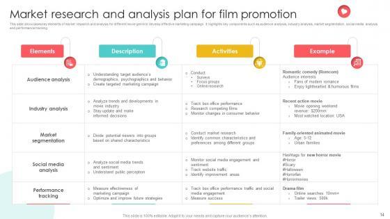 This slide showcases key elements of market research and analysis for different movie genre to develop effective marketing campaign. It highlights key components such as audience analysis, industry analysis, market segmentation, social media analysis and performance tracking. Retrieve professionally designed Marketing Channels For Movie Market Research And Analysis Plan For Film Promotion Strategy SS V to effectively convey your message and captivate your listeners. Save time by selecting pre-made slideshows that are appropriate for various topics, from business to educational purposes. These themes come in many different styles, from creative to corporate, and all of them are easily adjustable and can be edited quickly. Access them as PowerPoint templates or as Google Slides themes. You do not have to go on a hunt for the perfect presentation because Slidegeeks got you covered from everywhere. This slide showcases key elements of market research and analysis for different movie genre to develop effective marketing campaign. It highlights key components such as audience analysis, industry analysis, market segmentation, social media analysis and performance tracking.