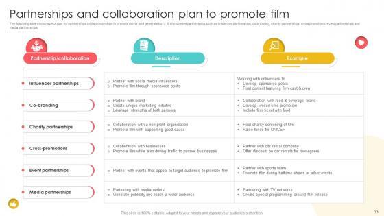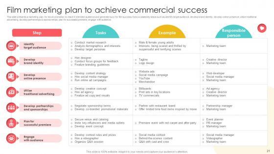 This slide presents a marketing plan for movie promotion to reach it intended audience and generate buzz for film success. It showcases key steps such as identify target audience, develop brand identity, develop online presence, utilize traditional advertising, develop partnerships and sponsorships, plan for successful premiere, engage with audience. Crafting an eye-catching presentation has never been more straightforward. Let your presentation shine with this tasteful yet straightforward Marketing Channels For Movie Film Marketing Plan To Achieve Commercial Success Strategy SS V template. It offers a minimalistic and classy look that is great for making a statement. The colors have been employed intelligently to add a bit of playfulness while still remaining professional. Construct the ideal Marketing Channels For Movie Film Marketing Plan To Achieve Commercial Success Strategy SS V that effortlessly grabs the attention of your audience Begin now and be certain to wow your customers This slide presents a marketing plan for movie promotion to reach it intended audience and generate buzz for film success. It showcases key steps such as identify target audience, develop brand identity, develop online presence, utilize traditional advertising, develop partnerships and sponsorships, plan for successful premiere, engage with audience.