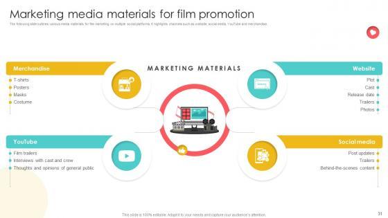The following slide outlines various media materials for film marketing on multiple social platforms. It highlights channels such as website, social media, YouTube and merchandise. Presenting this PowerPoint presentation, titled Marketing Channels For Movie Marketing Media Materials For Film Promotion Strategy SS V, with topics curated by our researchers after extensive research. This editable presentation is available for immediate download and provides attractive features when used. Download now and captivate your audience. Presenting this Marketing Channels For Movie Marketing Media Materials For Film Promotion Strategy SS V. Our researchers have carefully researched and created these slides with all aspects taken into consideration. This is a completely customizable Marketing Channels For Movie Marketing Media Materials For Film Promotion Strategy SS V that is available for immediate downloading. Download now and make an impact on your audience. Highlight the attractive features available with our PPTs. The following slide outlines various media materials for film marketing on multiple social platforms. It highlights channels such as website, social media, YouTube and merchandise.