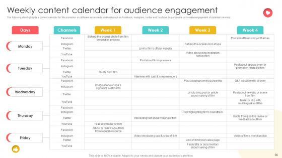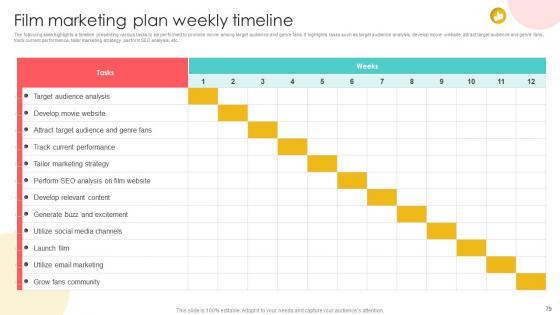 The following slide highlights a timeline presenting various tasks to be performed to promote movie among target audience and genre fans. It highlights tasks such as target audience analysis, develop movie website, attract target audience and genre fans, track current performance, tailor marketing strategy, perform SEO analysis, etc. Make sure to capture your audiences attention in your business displays with our gratis customizable Marketing Channels For Movie Film Marketing Plan Weekly Timeline Strategy SS V. These are great for business strategies, office conferences, capital raising or task suggestions. If you desire to acquire more customers for your tech business and ensure they stay satisfied, create your own sales presentation with these plain slides. The following slide highlights a timeline presenting various tasks to be performed to promote movie among target audience and genre fans. It highlights tasks such as target audience analysis, develop movie website, attract target audience and genre fans, track current performance, tailor marketing strategy, perform SEO analysis, etc.