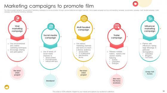 The following slide highlights various types of marketing campaigns for movie promotion through various traditional and digital channels. It showcases campaign such as viral marketing campaign, social media campaign, multi faceted campaign, trailer campaign and influencer marketing campaign. Slidegeeks has constructed Marketing Channels For Movie Marketing Campaigns To Promote Film Strategy SS V after conducting extensive research and examination. These presentation templates are constantly being generated and modified based on user preferences and critiques from editors. Here, you will find the most attractive templates for a range of purposes while taking into account ratings and remarks from users regarding the content. This is an excellent jumping-off point to explore our content and will give new users an insight into our top-notch PowerPoint Templates. The following slide highlights various types of marketing campaigns for movie promotion through various traditional and digital channels. It showcases campaign such as viral marketing campaign, social media campaign, multi faceted campaign, trailer campaign and influencer marketing campaign.