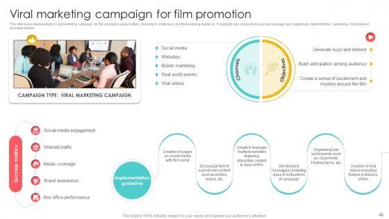 This slide showcases sample of viral marketing campaign for film promotion using multiple channels to create buzz and interest among audience. It highlights key components such as campaign type, objectives, implementation guidelines, channels and success metrics. The Marketing Channels For Movie Viral Marketing Campaign For Film Promotion Strategy SS V is a compilation of the most recent design trends as a series of slides. It is suitable for any subject or industry presentation, containing attractive visuals and photo spots for businesses to clearly express their messages. This template contains a variety of slides for the user to input data, such as structures to contrast two elements, bullet points, and slides for written information. Slidegeeks is prepared to create an impression. This slide showcases sample of viral marketing campaign for film promotion using multiple channels to create buzz and interest among audience. It highlights key components such as campaign type, objectives, implementation guidelines, channels and success metrics.