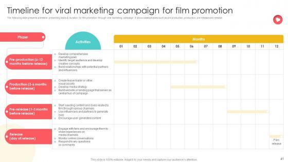 The following slide presents a timeline presenting tasks and duration for film promotion through viral marketing campaign. It showcases phases such as pre production, production, pre release and release. This modern and well-arranged Marketing Channels For Movie Timeline For Viral Marketing Campaign For Film Promotion Strategy SS V provides lots of creative possibilities. It is very simple to customize and edit with the Powerpoint Software. Just drag and drop your pictures into the shapes. All facets of this template can be edited with Powerpoint, no extra software is necessary. Add your own material, put your images in the places assigned for them, adjust the colors, and then you can show your slides to the world, with an animated slide included. The following slide presents a timeline presenting tasks and duration for film promotion through viral marketing campaign. It showcases phases such as pre production, production, pre release and release.