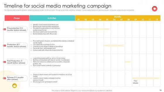 The following slide presents a timeline presenting tasks and duration for film promotion through social media marketing campaign. It showcases phases such as pre production, production, post production and release. Formulating a presentation can take up a lot of effort and time, so the content and message should always be the primary focus. The visuals of the PowerPoint can enhance the presenters message, so our Marketing Channels For Movie Timeline For Social Media Marketing Campaign Strategy SS V was created to help save time. Instead of worrying about the design, the presenter can concentrate on the message while our designers work on creating the ideal templates for whatever situation is needed. Slidegeeks has experts for everything from amazing designs to valuable content, we have put everything into Marketing Channels For Movie Timeline For Social Media Marketing Campaign Strategy SS V. The following slide presents a timeline presenting tasks and duration for film promotion through social media marketing campaign. It showcases phases such as pre production, production, post production and release.
