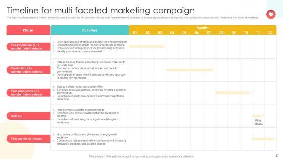 The following slide presents a timeline presenting tasks and duration for film promotion through multi faceted marketing campaign. It showcases phases such as pre production, production, post production, release and first month after release. Make sure to capture your audiences attention in your business displays with our gratis customizable Marketing Channels For Movie Timeline For Multi Faceted Marketing Campaign Strategy SS V. These are great for business strategies, office conferences, capital raising or task suggestions. If you desire to acquire more customers for your tech business and ensure they stay satisfied, create your own sales presentation with these plain slides. The following slide presents a timeline presenting tasks and duration for film promotion through multi faceted marketing campaign. It showcases phases such as pre production, production, post production, release and first month after release.