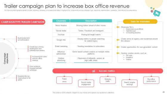 You will save yourself your energy and hours of time when you choose to use this impactful PowerPoint Deck. This Marketing Channels For Movie Marketing Strategy CD V has been tailor-made to your business needs which ensures that you will always be prepared for that next meeting. Worry can not touch you when you present in your area of expertise using this PPT Template Bundle. With a modern design and easy to follow structure, this PowerPoint Presentation has eighty four slides, which ensures that you can cover you need to without much work. Create your next presentation using this PPT Theme to deliver a memorable performance. Our Marketing Channels For Movie Marketing Strategy CD V are topically designed to provide an attractive backdrop to any subject. Use them to look like a presentation pro.