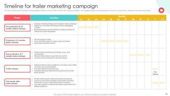 The following slide presents a timeline presenting tasks and duration for film promotion through trailer marketing campaign. It showcases phases such as pre production, production, post production, release and first month after release. Coming up with a presentation necessitates that the majority of the effort goes into the content and the message you intend to convey. The visuals of a PowerPoint presentation can only be effective if it supplements and supports the story that is being told. Keeping this in mind our experts created Marketing Channels For Movie Timeline For Trailer Marketing Campaign Strategy SS V to reduce the time that goes into designing the presentation. This way, you can concentrate on the message while our designers take care of providing you with the right template for the situation. The following slide presents a timeline presenting tasks and duration for film promotion through trailer marketing campaign. It showcases phases such as pre production, production, post production, release and first month after release.