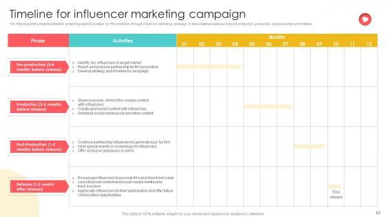 The following slide presents a timeline presenting tasks and duration for film promotion through influencer marketing campaign. It showcases phases such as pre production, production, post production and release. Crafting an eye-catching presentation has never been more straightforward. Let your presentation shine with this tasteful yet straightforward Marketing Channels For Movie Timeline For Influencer Marketing Campaign Strategy SS V template. It offers a minimalistic and classy look that is great for making a statement. The colors have been employed intelligently to add a bit of playfulness while still remaining professional. Construct the ideal Marketing Channels For Movie Timeline For Influencer Marketing Campaign Strategy SS V that effortlessly grabs the attention of your audience Begin now and be certain to wow your customers The following slide presents a timeline presenting tasks and duration for film promotion through influencer marketing campaign. It showcases phases such as pre production, production, post production and release.