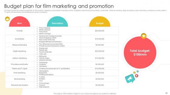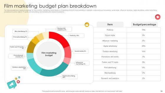 The following slide showcases a budget plan for film promotion highlighting cost breakdown of marketing efforts for movie marketing. It highlights components such as publicity, social media, influencer marketing, digital advertising, outdoor advertising, promotions and events, trailer and TV spots, print advertising, merchandising and research and analytics. If you are looking for a format to display your unique thoughts, then the professionally designed Marketing Channels For Movie Film Marketing Budget Plan Breakdown Strategy SS V is the one for you. You can use it as a Google Slides template or a PowerPoint template. Incorporate impressive visuals, symbols, images, and other charts. Modify or reorganize the text boxes as you desire. Experiment with shade schemes and font pairings. Alter, share or cooperate with other people on your work. Download Marketing Channels For Movie Film Marketing Budget Plan Breakdown Strategy SS V and find out how to give a successful presentation. Present a perfect display to your team and make your presentation unforgettable. The following slide showcases a budget plan for film promotion highlighting cost breakdown of marketing efforts for movie marketing. It highlights components such as publicity, social media, influencer marketing, digital advertising, outdoor advertising, promotions and events, trailer and TV spots, print advertising, merchandising and research and analytics.