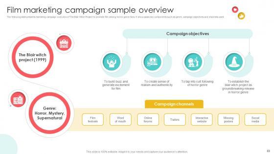 The following slide presents marketing campaign overview of The Blair Witch Project to promote film among horror genre fans. It showcases key components such as genre, campaign objectives and channels used. Are you in need of a template that can accommodate all of your creative concepts This one is crafted professionally and can be altered to fit any style. Use it with Google Slides or PowerPoint. Include striking photographs, symbols, depictions, and other visuals. Fill, move around, or remove text boxes as desired. Test out color palettes and font mixtures. Edit and save your work, or work with colleagues. Download Marketing Channels For Movie Film Marketing Campaign Sample Overview Strategy SS V and observe how to make your presentation outstanding. Give an impeccable presentation to your group and make your presentation unforgettable. The following slide presents marketing campaign overview of The Blair Witch Project to promote film among horror genre fans. It showcases key components such as genre, campaign objectives and channels used.