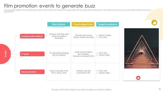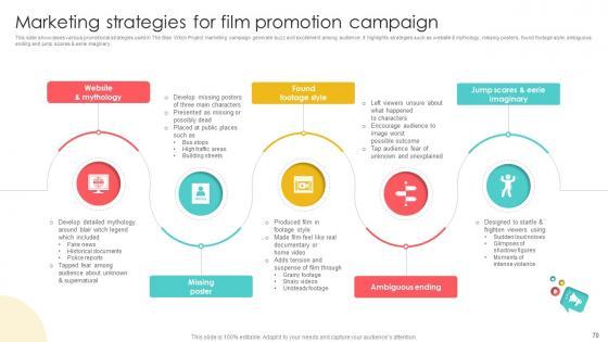 This slide showcases various promotional strategies used in The Blair Witch Project marketing campaign generate buzz and excitement among audience. It highlights strategies such as website and mythology, missing posters, found footage style, ambiguous ending and jump scares and eerie imaginary. Take your projects to the next level with our ultimate collection of Marketing Channels For Movie Marketing Strategies For Film Promotion Campaign Strategy SS V. Slidegeeks has designed a range of layouts that are perfect for representing task or activity duration, keeping track of all your deadlines at a glance. Tailor these designs to your exact needs and give them a truly corporate look with your own brand colors they will make your projects stand out from the rest This slide showcases various promotional strategies used in The Blair Witch Project marketing campaign generate buzz and excitement among audience. It highlights strategies such as website and mythology, missing posters, found footage style, ambiguous ending and jump scares and eerie imaginary.