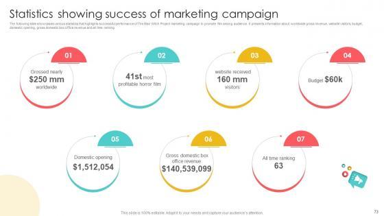 The following slide showcases various statistics that highlights successful performance of The Blair Witch Project marketing campaign to promote film among audience. It presents information about worldwide gross revenue, website visitors, budget, domestic opening, gross domestic box office revenue and all time ranking. If your project calls for a presentation, then Slidegeeks is your go-to partner because we have professionally designed, easy-to-edit templates that are perfect for any presentation. After downloading, you can easily edit Marketing Channels For Movie Statistics Showing Success Of Marketing Campaign Strategy SS V and make the changes accordingly. You can rearrange slides or fill them with different images. Check out all the handy templates The following slide showcases various statistics that highlights successful performance of The Blair Witch Project marketing campaign to promote film among audience. It presents information about worldwide gross revenue, website visitors, budget, domestic opening, gross domestic box office revenue and all time ranking.