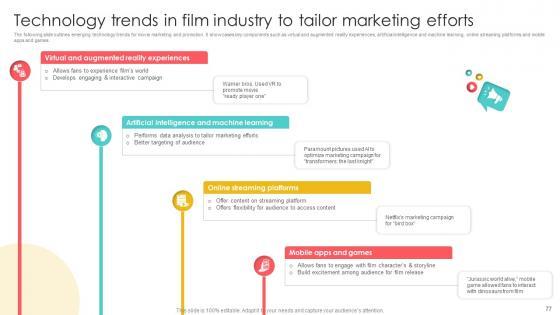 The following slide outlines emerging technology trends for movie marketing and promotion. It showcases key components such as virtual and augmented reality experiences, artificial intelligence and machine learning, online streaming platforms and mobile apps and games. Are you in need of a template that can accommodate all of your creative concepts This one is crafted professionally and can be altered to fit any style. Use it with Google Slides or PowerPoint. Include striking photographs, symbols, depictions, and other visuals. Fill, move around, or remove text boxes as desired. Test out color palettes and font mixtures. Edit and save your work, or work with colleagues. Download Marketing Channels For Movie Technology Trends In Film Industry To Tailor Marketing Efforts Strategy SS V and observe how to make your presentation outstanding. Give an impeccable presentation to your group and make your presentation unforgettable. The following slide outlines emerging technology trends for movie marketing and promotion. It showcases key components such as virtual and augmented reality experiences, artificial intelligence and machine learning, online streaming platforms and mobile apps and games.
